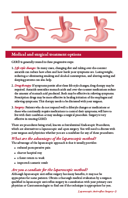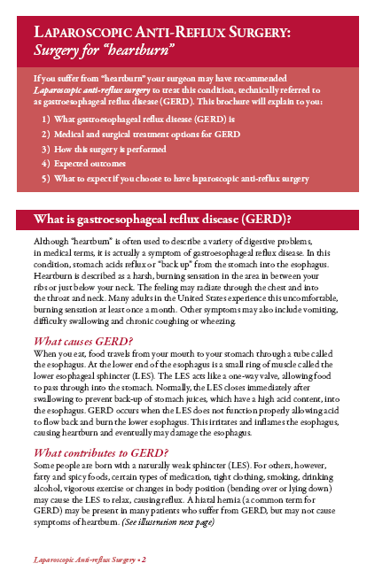 The SAGES Educational Resources Committee has developed this patient information brochure on Laparoscopic Anti-Reflux Surgery to assist surgeons in preparing their patients for surgery. Given the variations in technique, SAGES has designed this patient handout to describe the most commonly performed techniques for Anti-Reflux treatment, including: