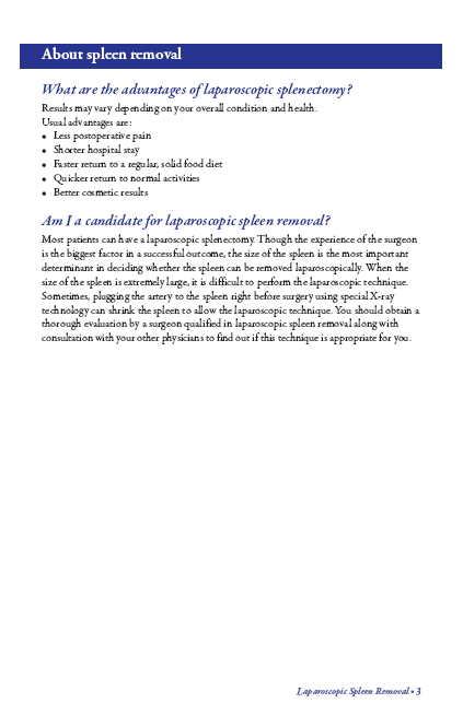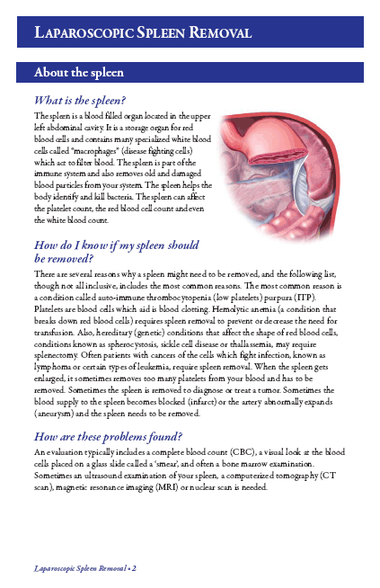 The SAGES Educational Resources Committee has developed this patient information brochure on Laparoscopic Spleen Removal to assist surgeons in preparing their patients for surgery. Given the variations in technique, SAGES has designed this patient handout to describe the most commonly performed techniques for spleen removal, including:
