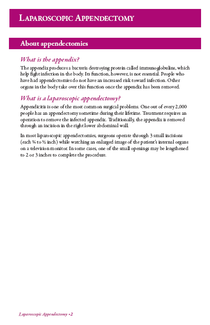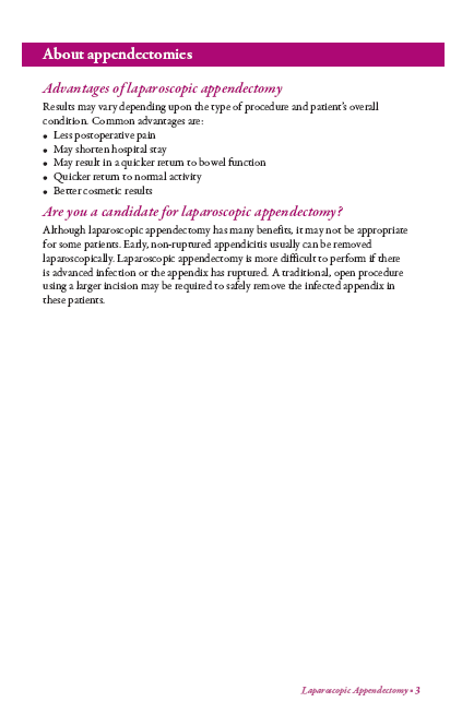 The SAGES Educational Resources Committee has developed this patient information brochure on Laparoscopic Appendectomy to assist surgeons in preparing their patients for surgery. Given the variations in technique, SAGES has designed this patient handout to describe the most commonly performed techniques for removal of the appendix, including: