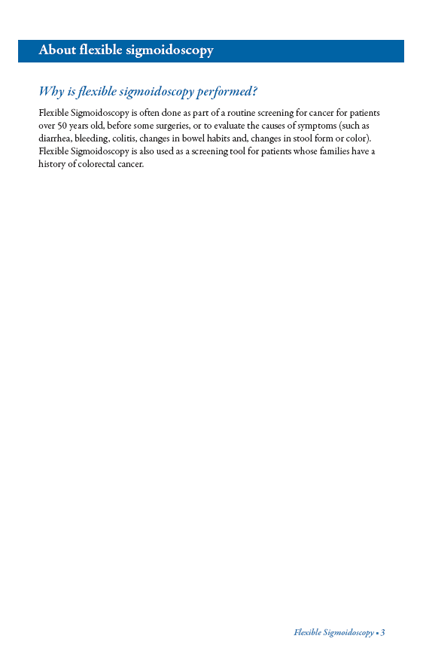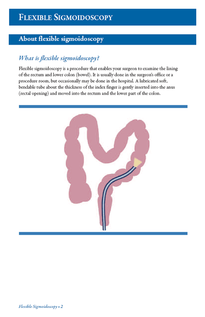 The SAGES Educational Resources Committee has developed this patient information brochure on Flexible Sigmoidoscopy to assist surgeons in preparing their patients for surgery. Given the variations in technique, SAGES has designed this patient handout to describe the most commonly performed techniques for flexible sigmoidoscopy, including: